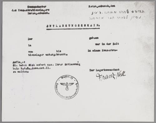 Foto van een bewijs van ontslag uit concentratiekamp Vught, niet ingevuld.
