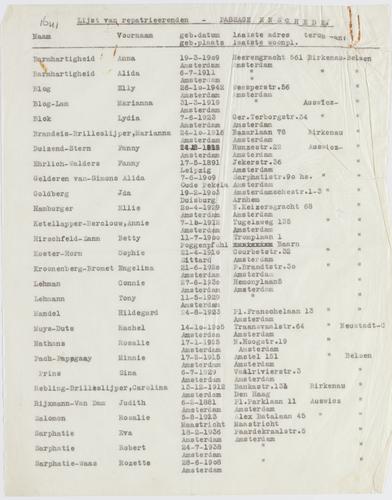 Lijst (5 p.) met namen van circa 150 joodse repatrianten, via Enschede, 1945
