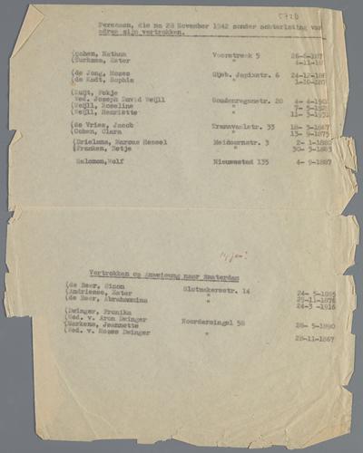 Naamlijst van twaalf personen die na 28 november 1942 zonder achterlating van adres uit Leeuwarden zijn vertrokken, en van zes personen die verplicht naar Amserdam zijn verhuisd.