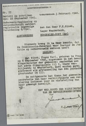 Verklaring dat Franz Sinek afstamt van één joodse grootouder, 's-Gravenhage, februari 1944