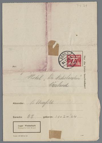 Brief uit Westerbork van Bep Sternfeld aan Willy Welter in Vreeland, juni 1944
