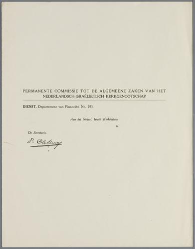 Circulaire van de Permanente Commissie tot Algemene Zaken van het Ned. Isr. Kerkgenootschap aan de joodse gemeenten over de aanslag voor het jaar 1941, d.d. december 1940.