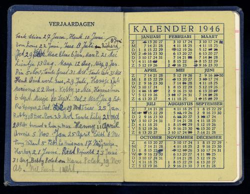 Agenda voor het jaar 1946 waarin Cornelia Polak-Bromet optekende in welke kampen ze gezeten heeft, 1946