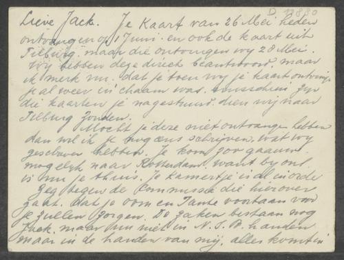 Briefkaart van Jacob (Jaap) van Gich, vanuit Rotterdam gestuurd aan zijn neef Jack Marcus, die in Noord-Brabant werd opgevangen, mei 1945
