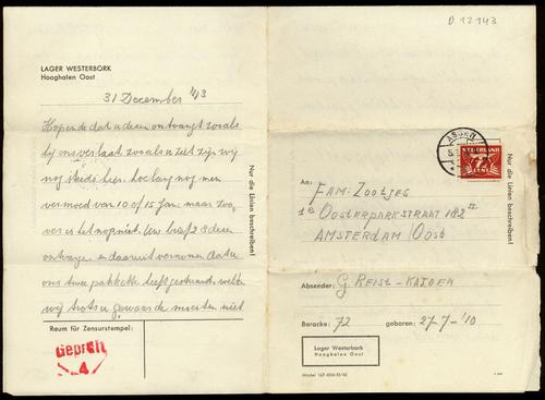 Brief uit Westerbork en briefkaart uit Bergen Belsen door de familie Reist-Katoen gestuurd aan Amsterdamse buurtbewoners, 1943-1944