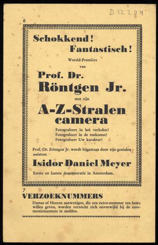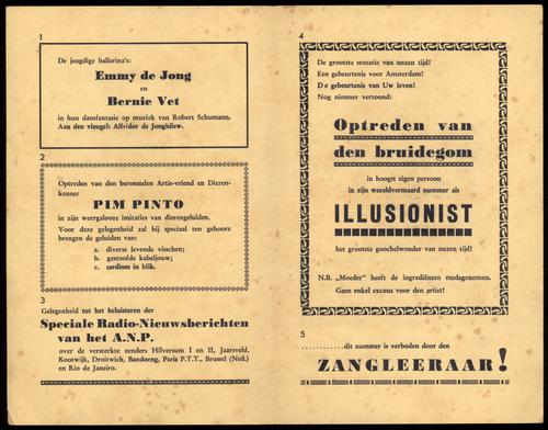 Programma t.g.v. het huwelijk van Alfred Blok en Carolina Füllenbaum met onder andere een aankondiging van de jeugdige ballerina's Emmy de Jong en Bernie Vet, 1939