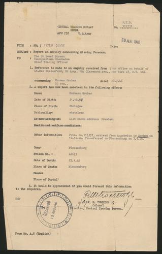 Verklaring van het Central Tracing Bureau UNRRA over de aankomst van Hermann Gruber vanuit Auschwitz in Dachau en zijn overlijden op 27 januari 1945 in Flossenburg, 1945