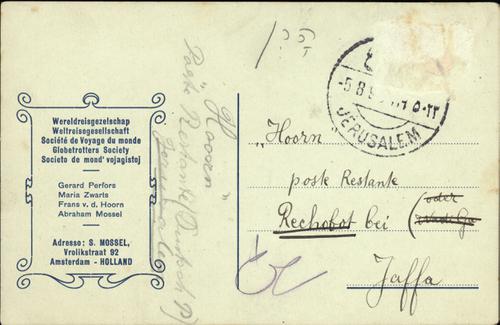 Briefkaart van Gerard Perfors (en Marie Zwarts) aan Frans van der Hoorn en Abraham Mossel, juli 1913