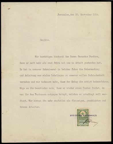 Getuigschrift van het Syrisch weeshuis in Jeruzalem, waar Gerard Perfors twee jaar als meubelmaker heeft gewerkt, in getypte en handgeschreven versie, 1914