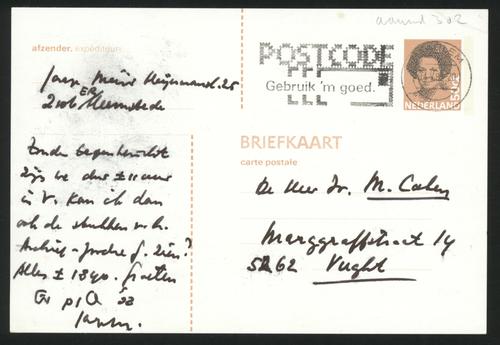 Briefkaart van Jaap Meijer aan ir. M. Cahen te Vught, Heemstede, 1982