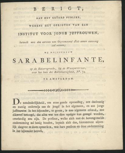 Drukwerk waarin Sara Belinfante aankondigt op de Keizersgracht bij de Weesperstraat een school voor jonge juffrouwen te beginnen, 1810