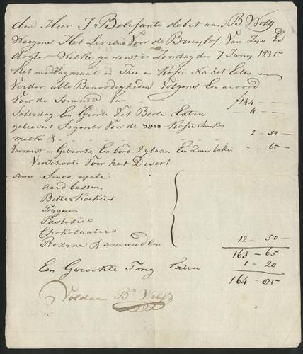 Rekening van B. Wolff voor J. Belinfante voor kosten gemaakt ten behoeve van de bruiloft van zijn dochter op 7 juni 1835