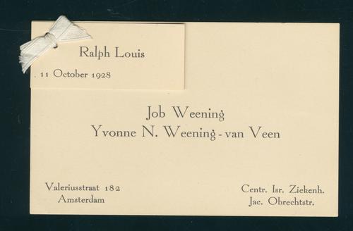 Biografie (4 p.) van Job (Jozef) Weening, geboorteberichten van zijn kinderen en enkele gedichten t.g.v. verjaardag en nieuwjaar, Amsterdam ca.1928-1960