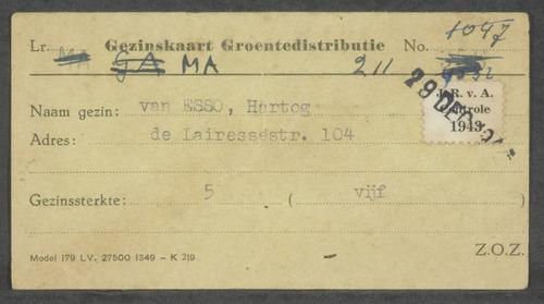 Gezinskaart Groentendistributie ten name van het gezin van Hartog van Esso, 1942