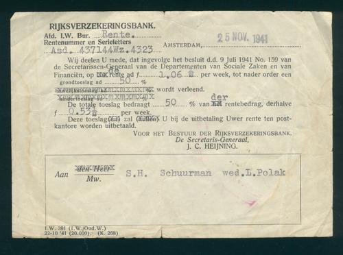 Mededeling van de Rijksverzekeringsbank aan Sjoektje Helena Polak-Schuurman over de uitkering van de wezenrente à 0,53 1/2 cent per week, 1941