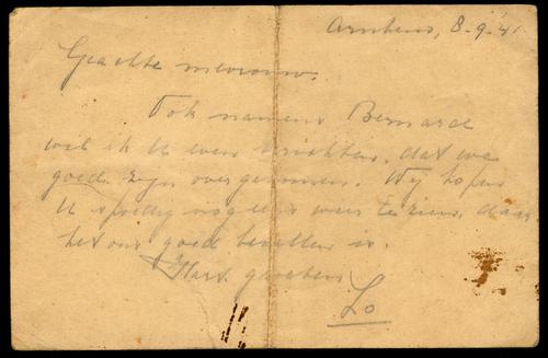 Briefkaart verstuurd door Salomon (Lo) Wijler, mede namens Bernard Sanders, vanuit Arnhem, september 1941
