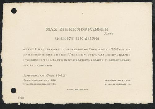 Kennisgeving voor de huwelijksceremonie van Max Ziekenopasser en Margaretha de Jong, 1942