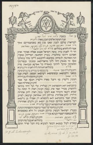 Huwelijkscontract van het Nederlands-Israelitisch Kerkgenootschsp betreffende de kerkelijke inzegening van het huwelijk van Max Ziekenopasser en Margaretha de Jong, 1942