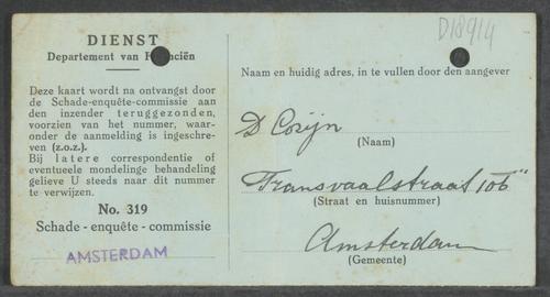 Registratiekaart van de Schade-Enquête Commissie, op naam van Duifje Cozijn, 1945