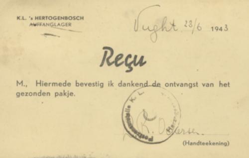Ontvangstbewijs voor een toegezonden pakket naar Concentratiekamp Vught, ten name van Armand Louis Ockersen, 1943