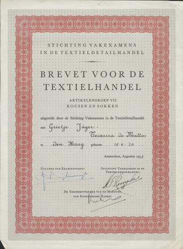 Brevet voor de textielhandel op naam van Grietje Jäger-Teixeira de Mattos, evenals de uitslag van het daarvoor afgelegde examens, 1955