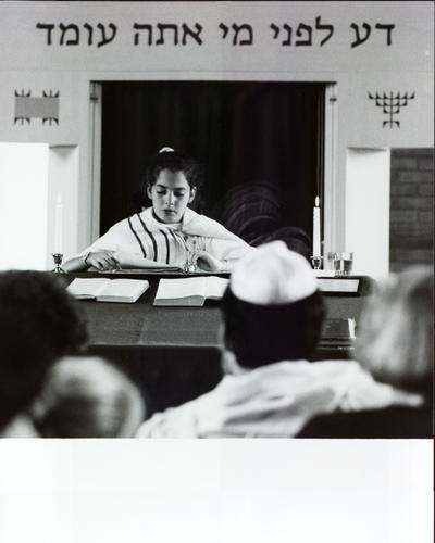 meisje tijdens haar bat mitswa, Liberaal Joodse Gemeente Arnhem 1988