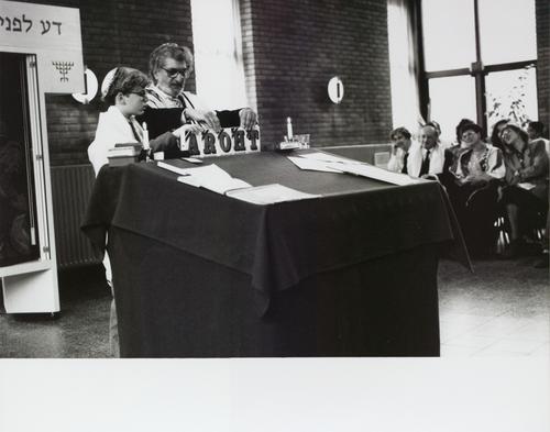 jongen tijdens zijn bar mitswa met Sonny Herman, Liberaal Joodse Gemeente Arnhem, --- 1990