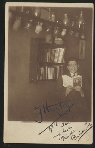 Foto's (2) met Jacques Hartog op ongeveer 21-jarige leeftijd zittend in zijn kamer met een boek 1916