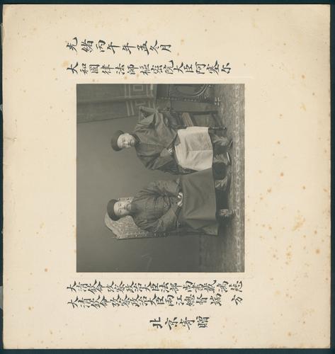 Portretfoto van twee Chinese heren met handgeschreven opdracht in het Chinees vermoedelijk aan T.M.C. Asser, ca. 1911