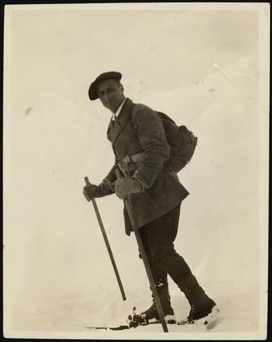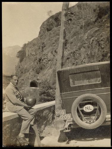 Foto's (4) van Louis Schaap met een auto bij de Simplonpas en als skiwandelaar in de bergen, ca. 1926