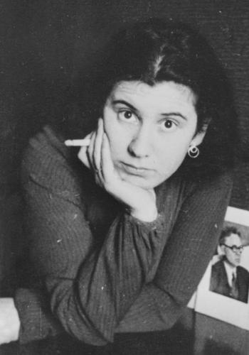 Portret van Etty Hillesum, met sigaret, circa 1937-1938. Op de achtergrond onder andere een jonge Stalin.