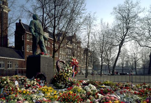De Dokwerker met bloemen ervoor. Iets van opzij genomen met op de achtergrond het J.D. Meijerplein, 1993