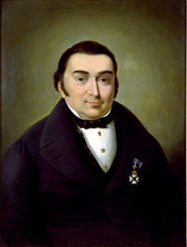Portret van een man, borststuk en face iets naar links, zwarte jas met ridderorde, wit overhemd met zwarte strik.