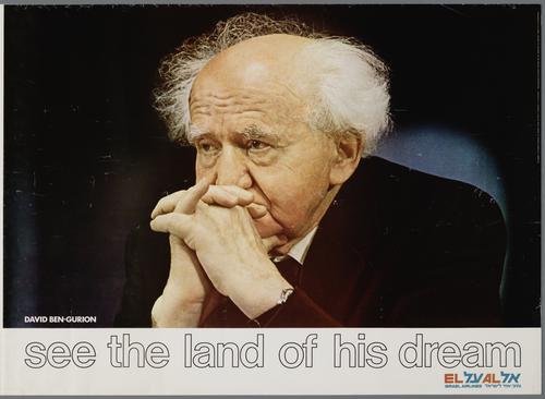 Foto (kop en schouders) van David Ben-Gurion, waarbij hij zijn handen in elkaar gevouwen voor zijn mond houdt. Donkere achtergrond. Tekst: in witte, bruine, blauwe letters, en zwart omlijnde letters op witte ondergrond.