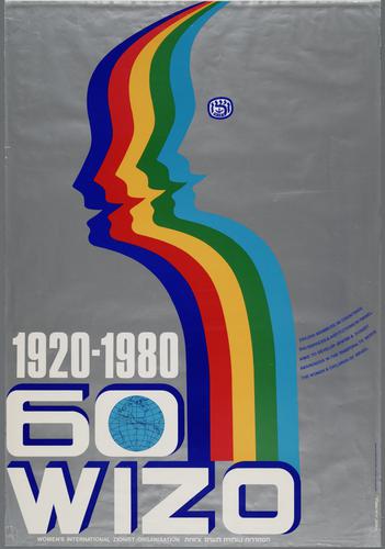 Grijze ondergrond, waarop profiel van een vrouwengezicht in 5 kleuren. In de O van Wizo een aardbol afgebeeld. Het WIZO embleem is ter hoogte van het oog, van een van de vrouwen afgebeeld. Tekst: in wit en blauwe letters.