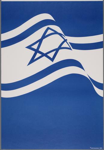 Wapperende Israëlische vlag in blauw en wit, op blauwe ondergrond.