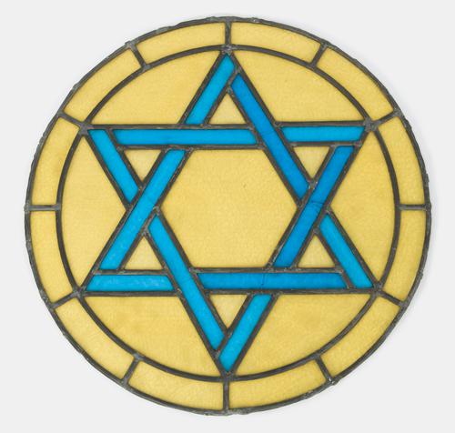 Blauwe davidster in gele cirkel. Om het geheel een rand met gele vlakken.