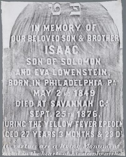 Tekst: hebreeuws & in memory of/ our beloved son & brother/ Isaac/ son of Solomon/ and Eva Lowenstein, born in Philadelphia pa/ may 2nd 1849/ died at Savannah / sept. 25th 1876,/ .uring the yellow fever epidem./ aged 27 months & 23 d.../ His virtues are a living monument/ .rected in the hearts of his deeply afflict.