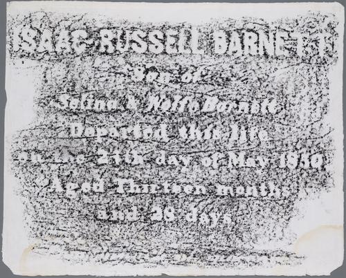 Tekst: Isaac Russell Barnett/ son of/ Selina & Wolfo Barnett/ departed this life/ on the 21th day of may 1850/ aged thirteen months/ and 28 days.