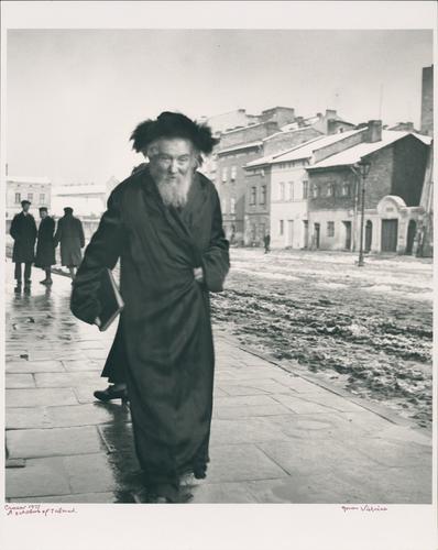 Portret van een man in religieuze kleding, ten voeten uit en face, loopt over straat. Op straat veel modderige sneeuw. Op de achtergrond huizen.