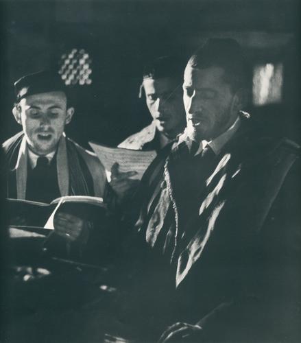 Drie mannen met gebedsmantels aan staan te zingen in een synagoge.