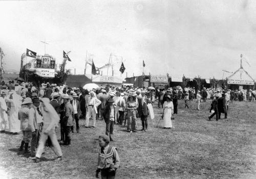 Landbouwtentoonstelling in Rechovot 1912. Linksvoor de stand van Carmel-wijnen. Concurrent van Ben Dov 'Fotografia Progress' in het midden. Wandelend publiek.