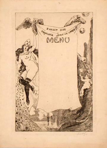 Menukaart met o.a. afbeelding van een naakte vrouw, een bellen blazend kind, een draak en een uil.
