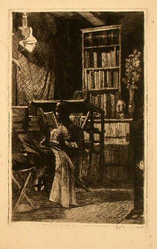 Interieur van een kamer. Op de voorgrond een zittende man, Felix Hess, die een boek aan het lezen is. Zijn voeten op een krukje.