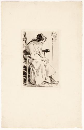 Portret van een vrouw, voorovergebogen zittend in een stoel. Hele figuur en trois quart naar rechts. De vrouw heeft klompen aan haar voeten.