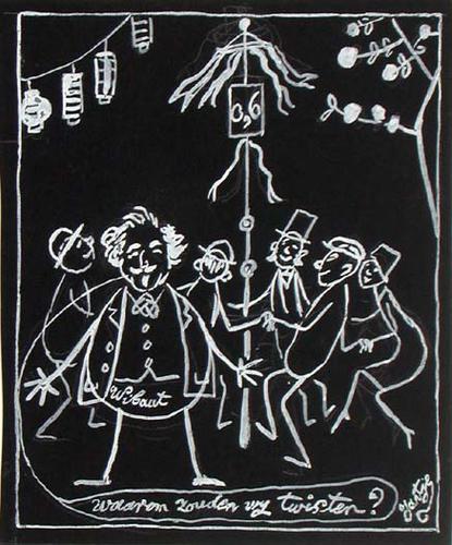 Spottende tekening waarop vijf figuurtjes rond een paal dansen waar op een bord met de tekst "0,6" hangt. Een dik figuurtje (Wibaut) staat vooraan en spreekt de tekst (tekstballon) "Waarom zouden wij twisten?"