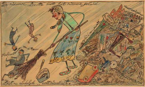 Vrouw met bezem in de hand houdt grote schoonmaak. Rechts de afvalhoop.