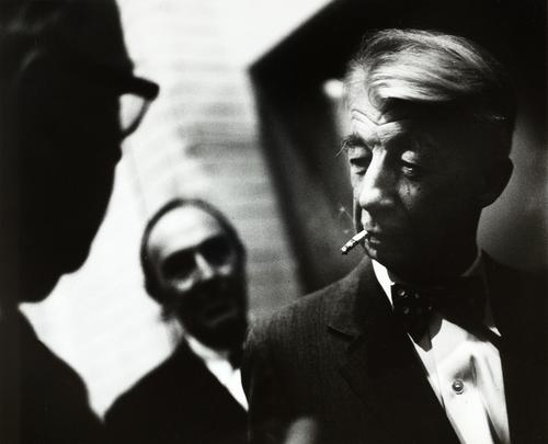 Portret van Willem Sandberg, met sigaret in de mond, tijdens uitreiking van de Sikkensprijs 1969.