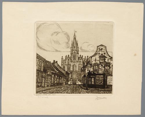 Gezicht op de Korenstraat in Eindhoven met huizen aan weerskanten. Aan het eind van de straat het Stadhuis (m). Vrouwenfiguur loopt op linkerstoep richting Stadhuis.