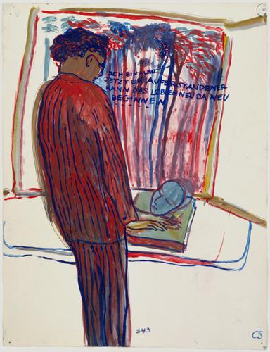 Daberlohn staat voor zijn schrijftafel voor het geopende raam; hij kijkt naar zijn voltooide manuscript en zijn dodenmasker dat erbovenop ligt. Daberlohn is gekleed in een rood pak met blauwe strepen, hij heeft de beide handen op het dichtgeslagen boek naast elkaar; tussen de vingers van zijn linkerhand houdt hij nog een sigaret vast. Daberlohn voelt zich -na de voltooiing van zijn boek- een herrezene; hij kan het leven opnieuw beginnen.